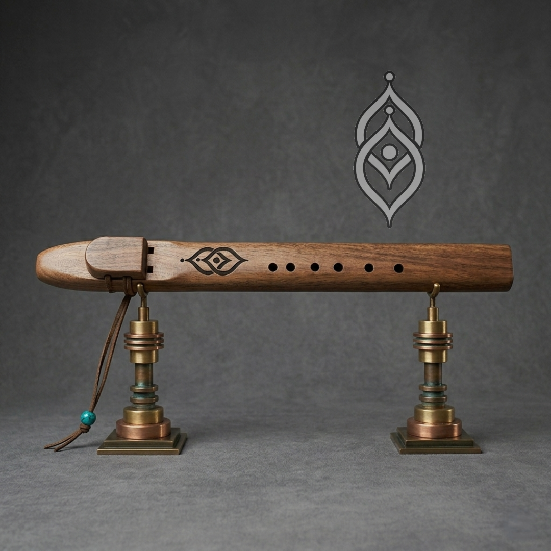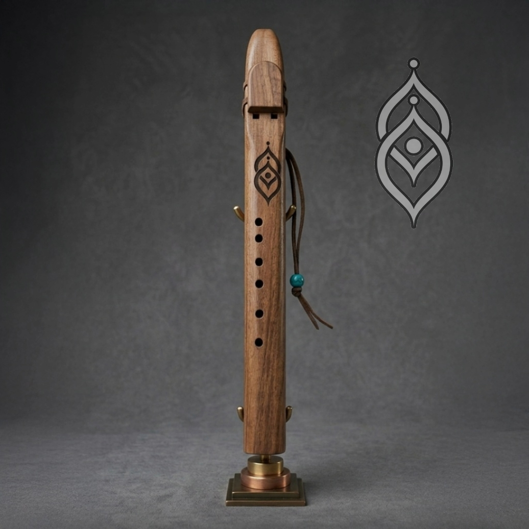 A handcrafted Akash Native American Drone Flute made from solid walnut wood, designed to produce a layered, meditative sound through a continuous harmonic drone paired with a clear melodic voice.